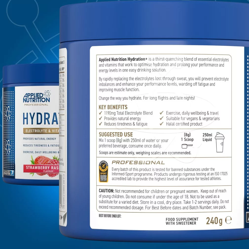 Az Applied Nutrition Hydration+ Electrolyte & Vitamin Powder egy prémium, cukormentes, mindössze ~10 kcal-os hidratáló italpor (240 g | 30 adag), amely kiegyensúlyozott elektrolit-keverékkel (nátrium, kálium, klorid, kalcium, magnézium) és C- valamint B-vitaminokkal támogatja a folyadékpótlást, az energiatermelést és az általános közérzetet. A kókuszvízpor, a taurin, az Aquamin™ tengeri ásványi komplex és az ír tengeri moha természetes ásványianyag-forrásként segítenek a rehidratálásban, az izomgörcsök megelőzésében és a fáradtság csökkentésében. Vegán, glutén- és tejmentes, Informed-Sport szerint tesztelt, így sportolóknak, aktív életmódot élőknek, utazáshoz, meleg időben vagy késő esti regenerálódáshoz is ideális.